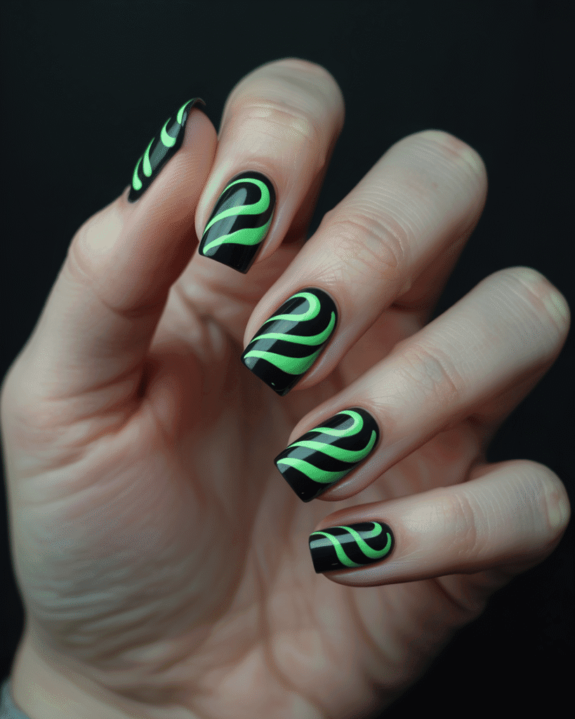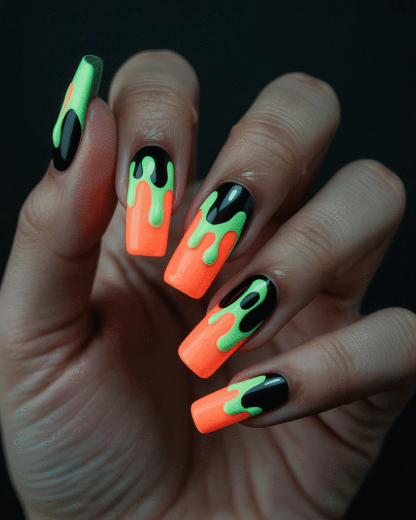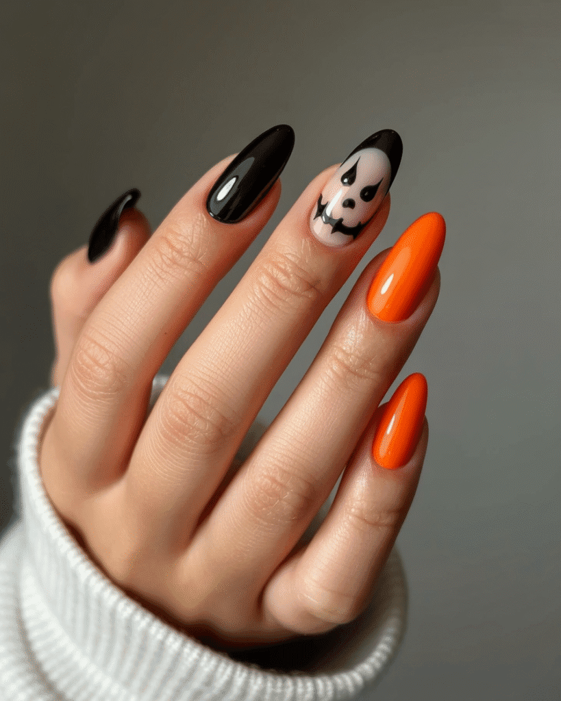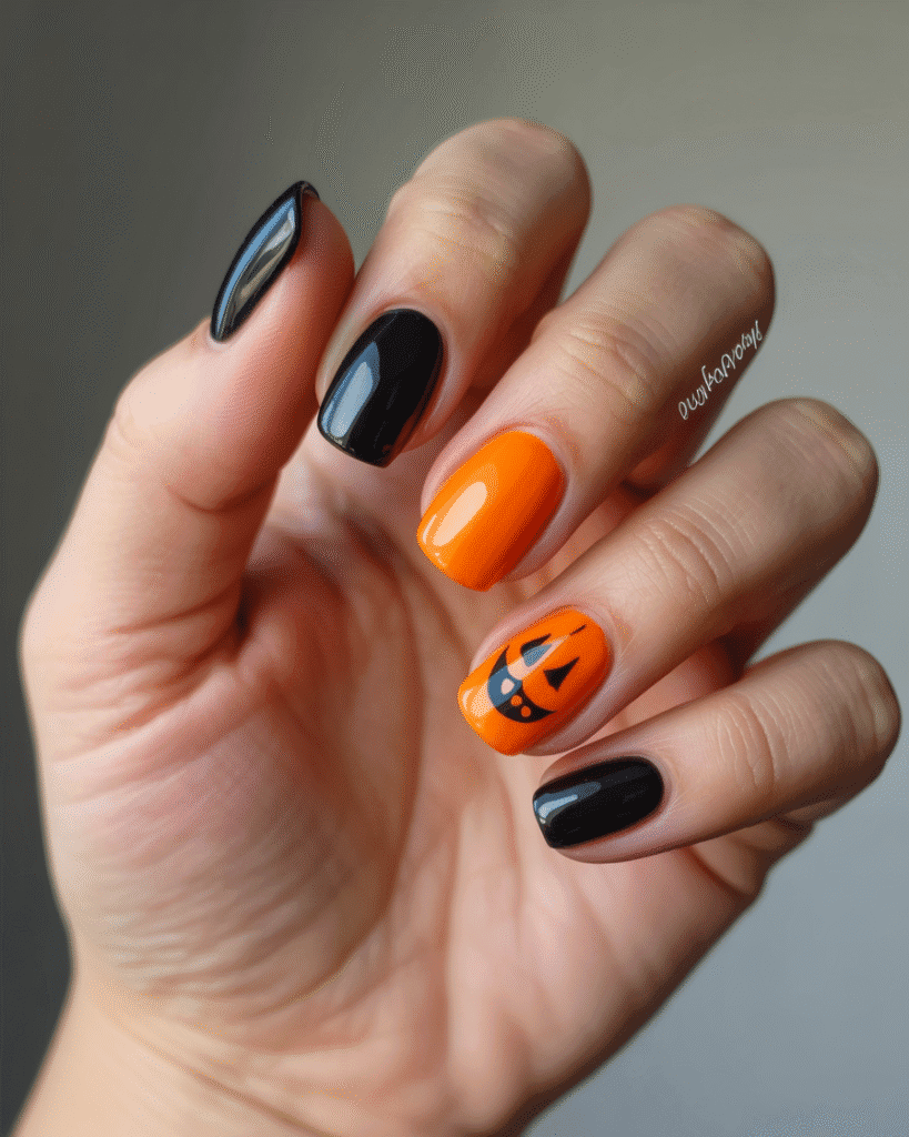 A timeless Halloween nail design β alternating glossy black and pumpkin orange polish.