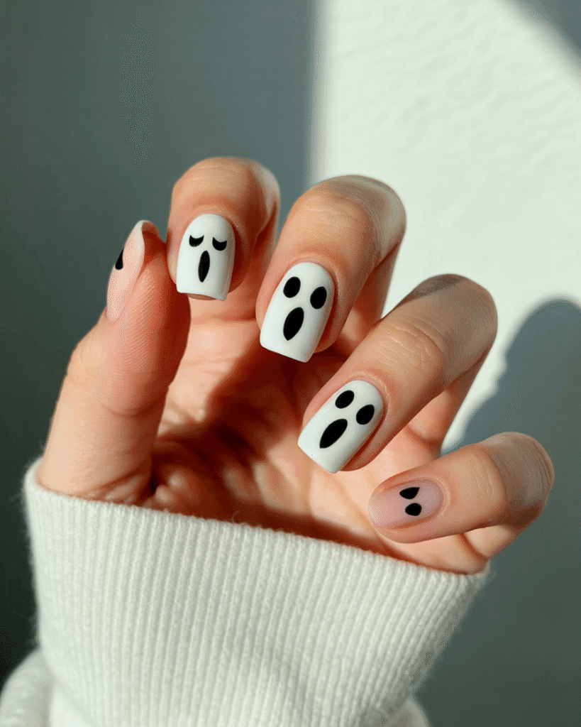 Cute ghost faces on pale nails for an easy Halloween nail design.