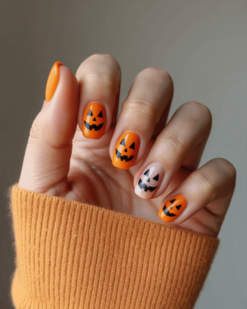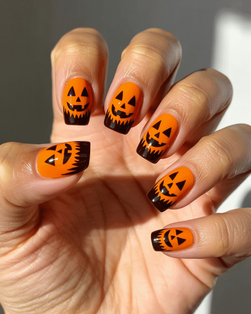 Tiny carved pumpkin faces hand-painted on accent nails.