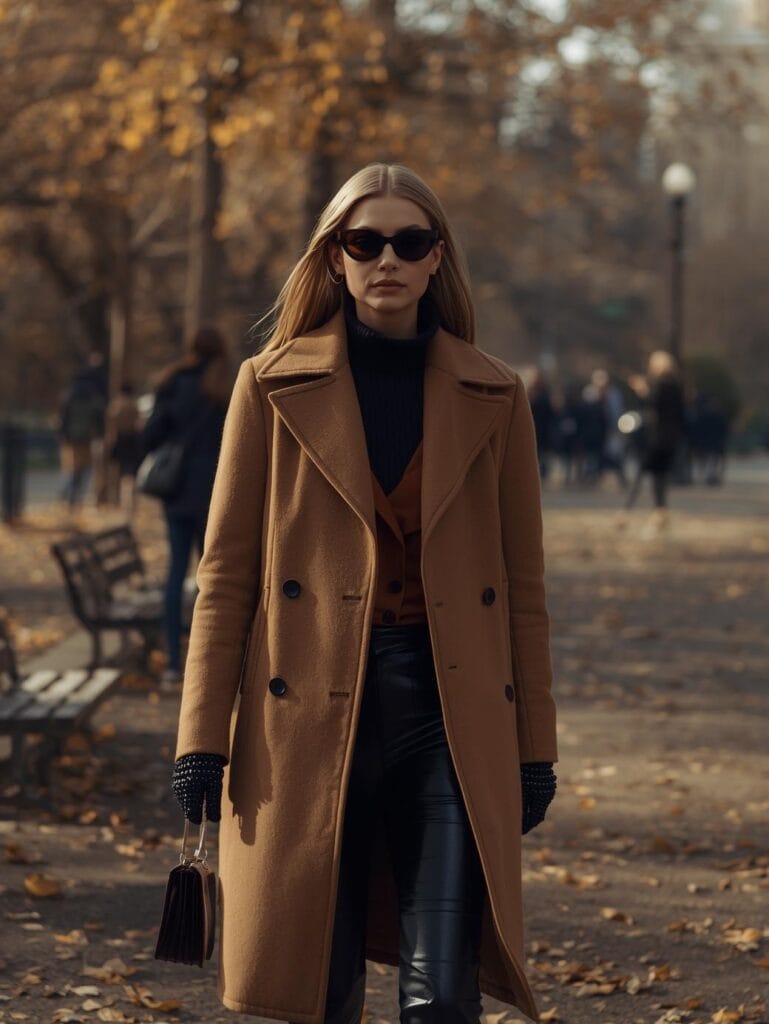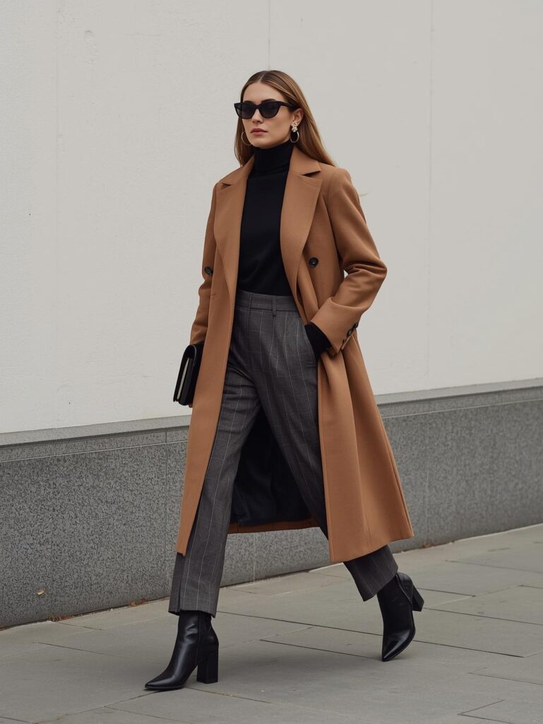 A double-breasted camel coat over a fine-knit turtleneck and pleated wool trousers. Add loafers or minimalist sneakers — it says, I invest in quality, not quantity.