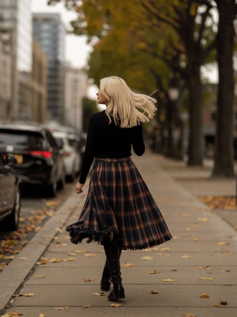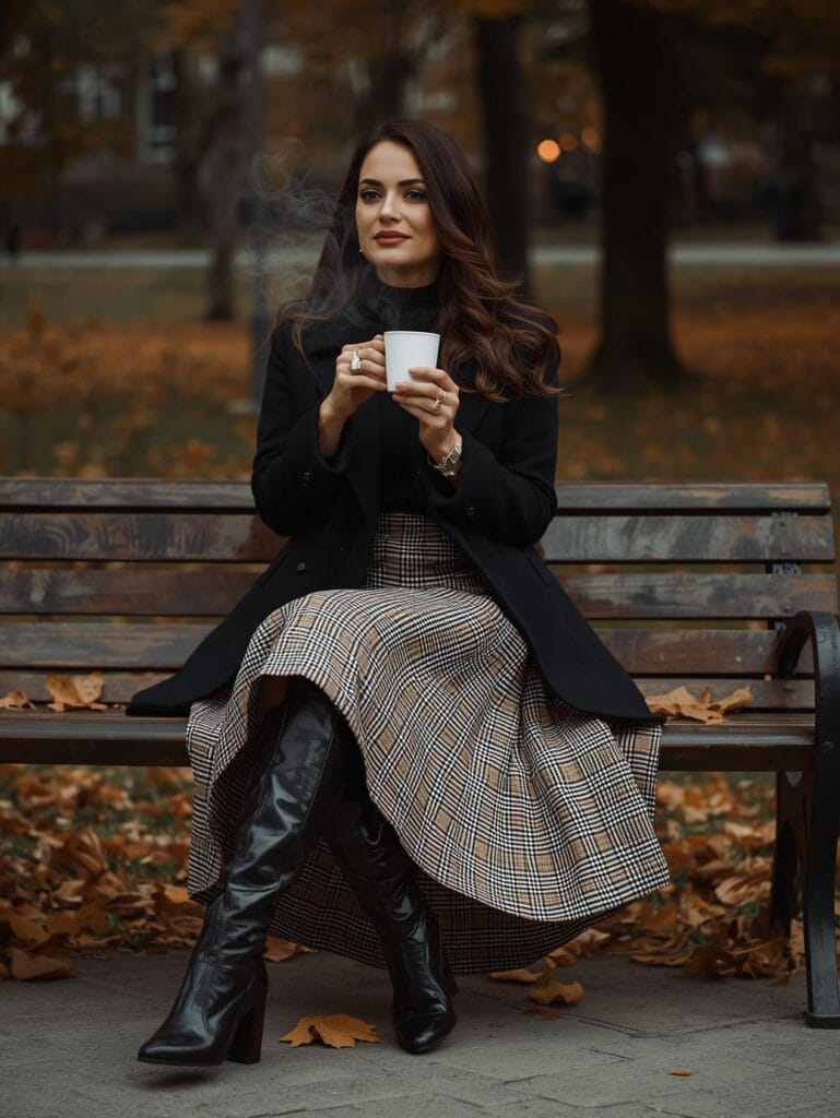 Plaid midi skirt, navy turtleneck, and brown boots. Heritage meets modernity.