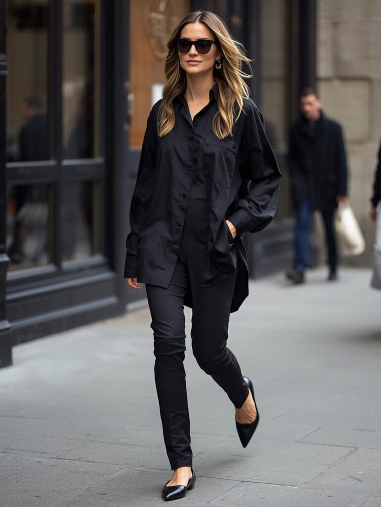 Oversized men’s shirt, structured trench, leggings, ballet flats. Baseball cap optional — off-duty chic.