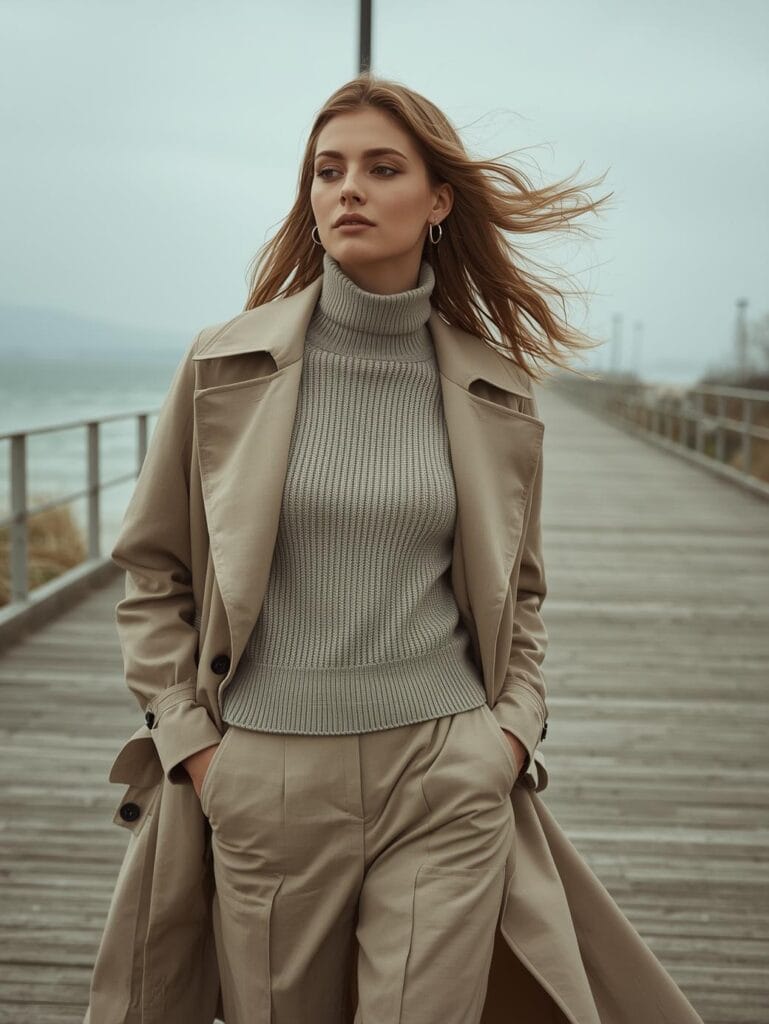 Long khaki trench tied at the waist, wide-leg wool pants, minimal gold jewelry. Timeless elegance.