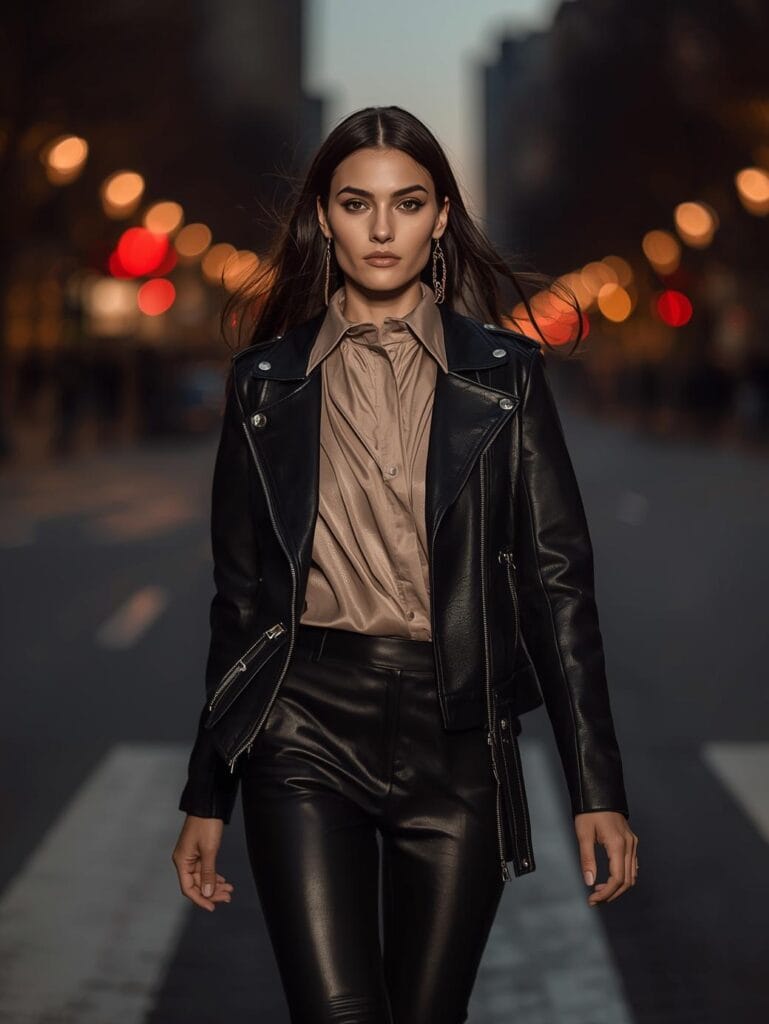 Silk blouse, oversized leather jacket, tailored black trousers. Add a gold watch and structured bag.