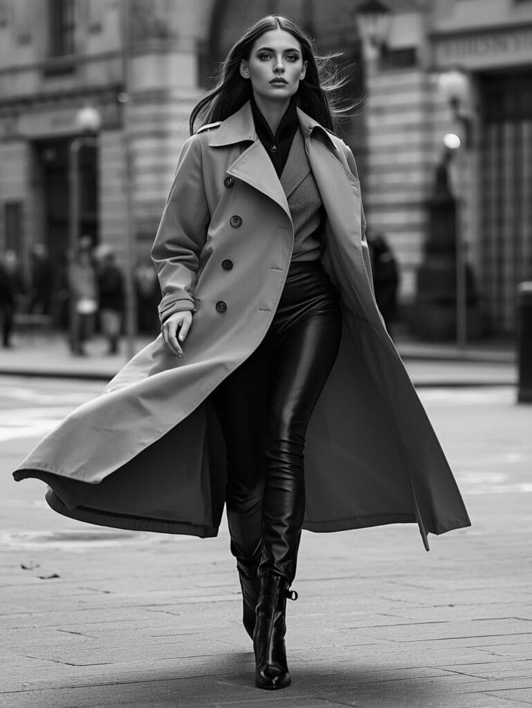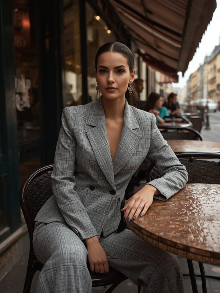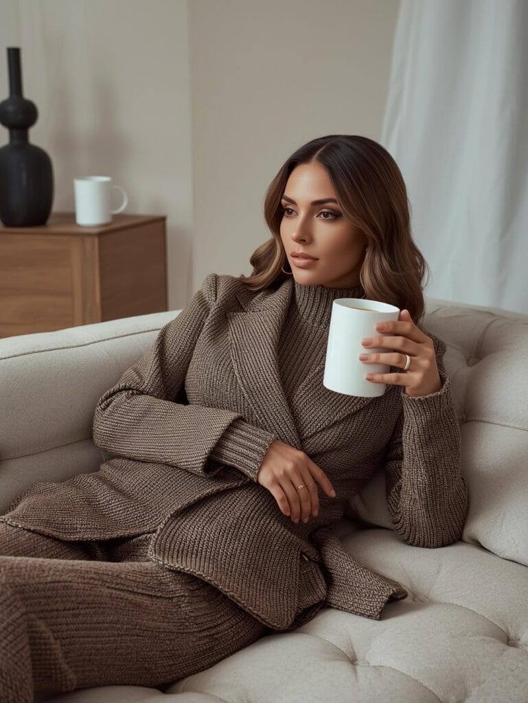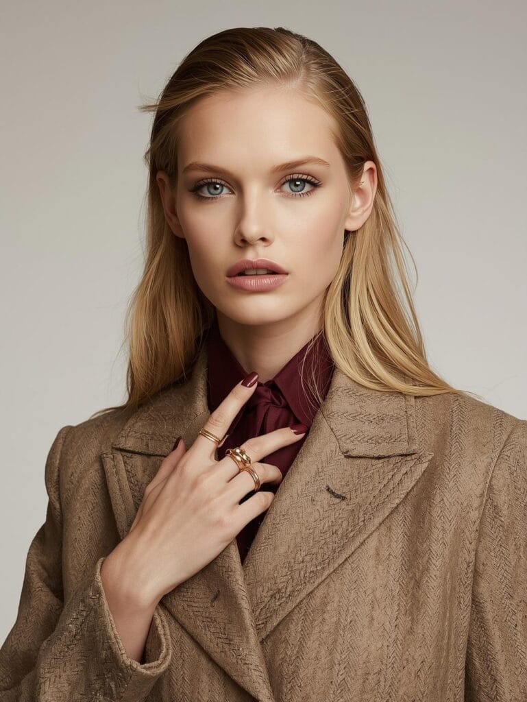 Colors stay grounded: camel, navy, charcoal, ivory, forest, chocolate. Fabrics: cashmere, tweed, wool, silk, suede. The aim isn’t perfection; it’s polish with personality — effortless luxury achieved through texture and tone.