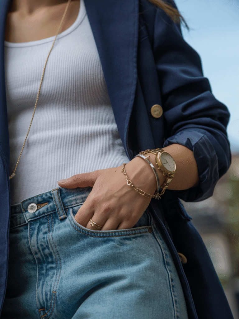 - Accessorize with intent: minimal gold, structured leather, silk accents.