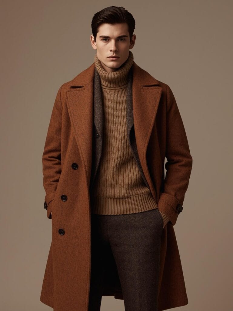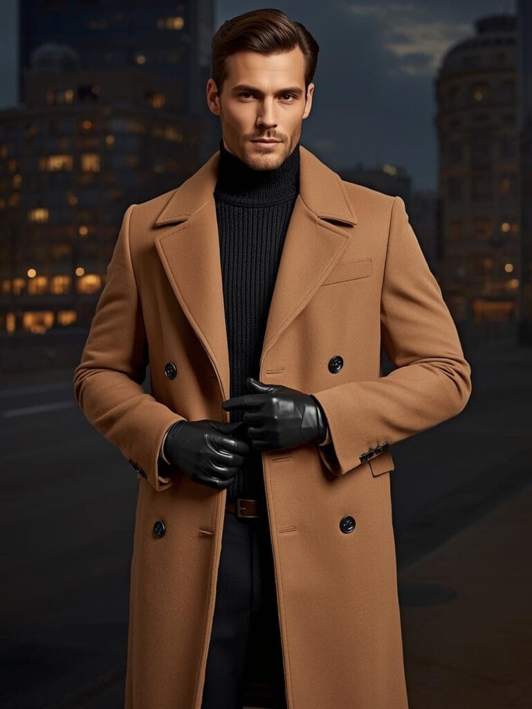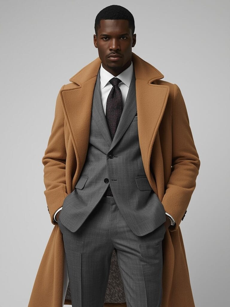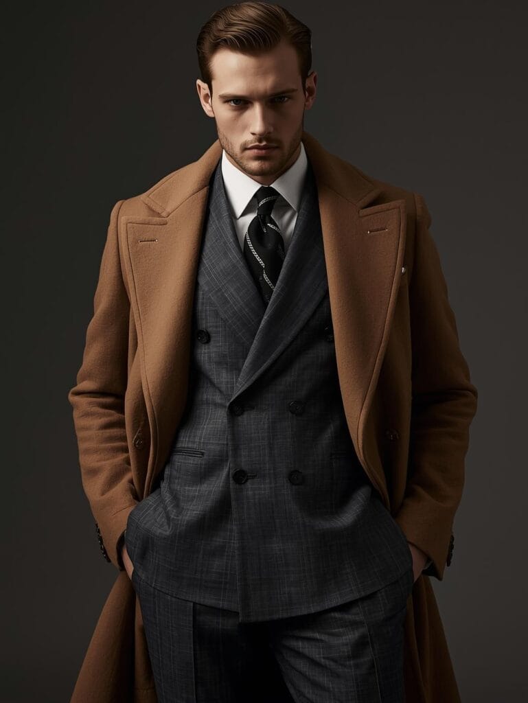 A tailored double-breasted suit layered beneath a camel overcoat — timeless power dressing.