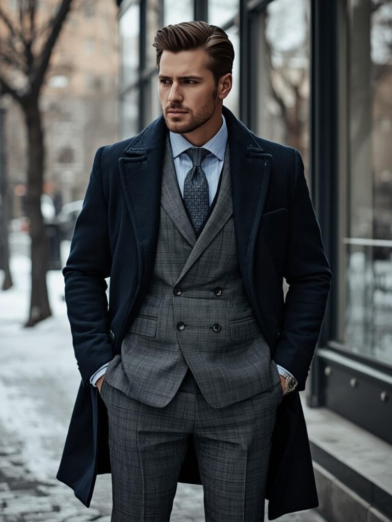 Layer a long navy overcoat over a gray suit. Add a beige cashmere scarf for a touch of warmth and sophistication.