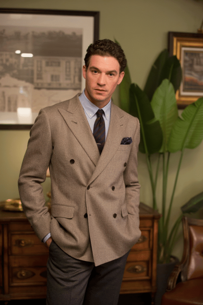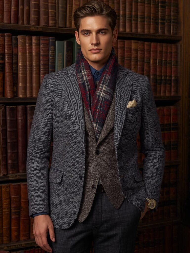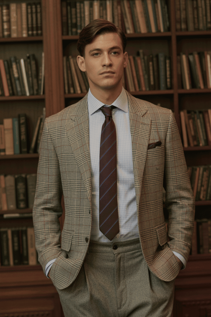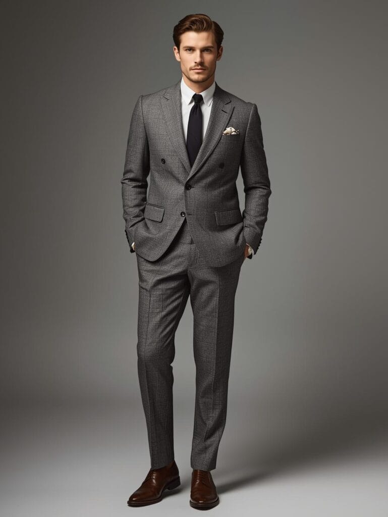 A gray or brown wool suit with polished brogues exudes aristocratic composure.