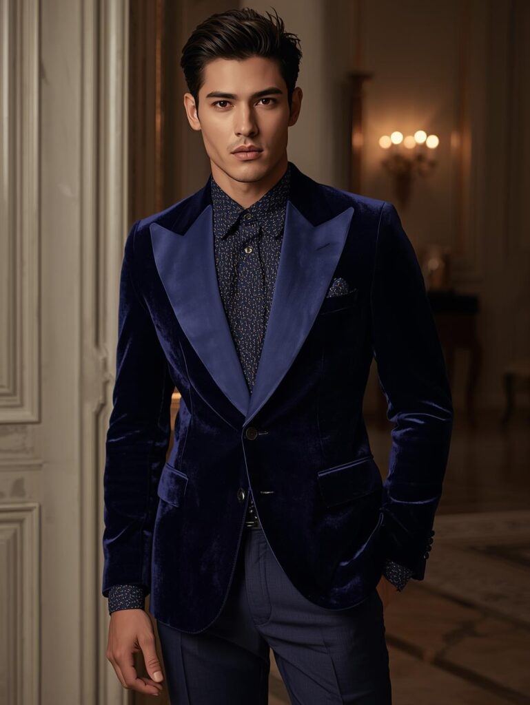 Perfect for evening events — deep navy velvet blazer and dark trousers.