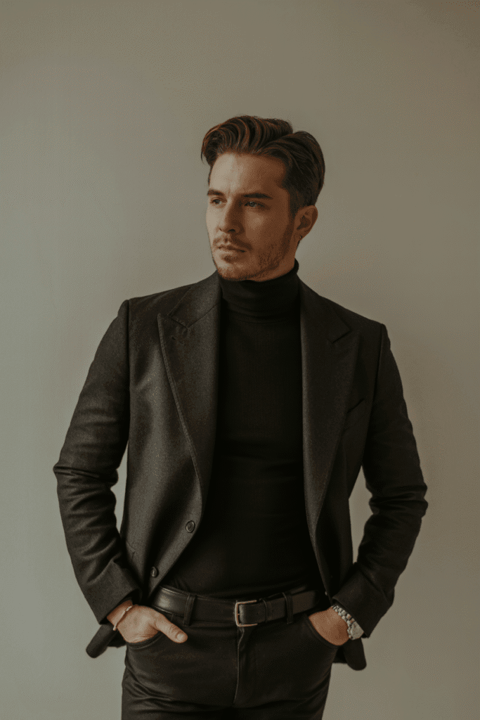 Pair a charcoal blazer with a black turtleneck and slim trousers. It’s sharp, minimal, and timeless.
