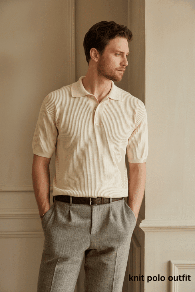 For understated class — cream knit polo, gray wool trousers, suede loafers.