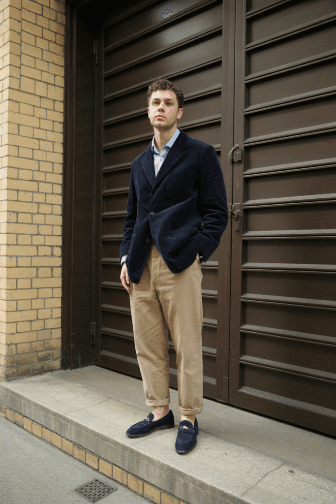 Classic preppy luxury — navy corduroy jacket, white shirt, and brown loafers.