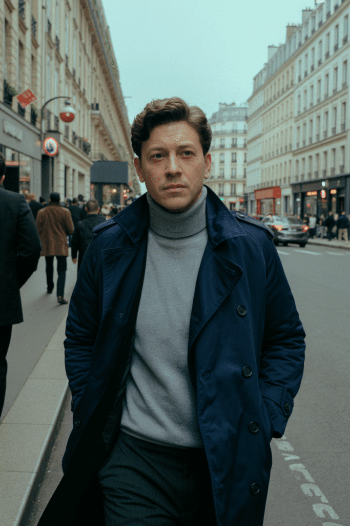 Channel old-world Parisian charm with a navy trench coat layered over a gray turtleneck and tailored trousers.