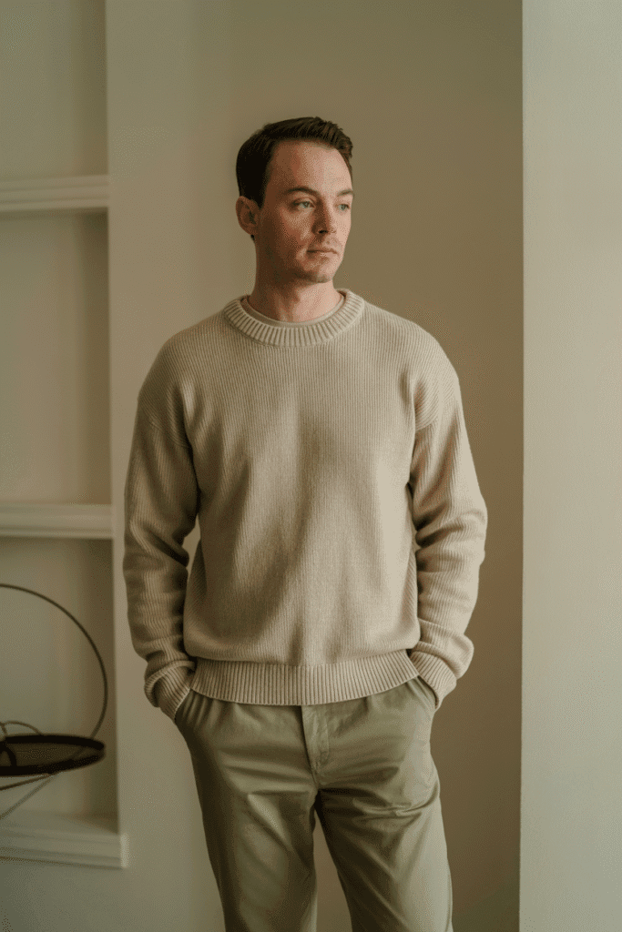 Understated comfort at its finest. A beige cashmere sweater tucked into olive chinos, paired with loafers and a wristwatch — the definition of effortless luxury.