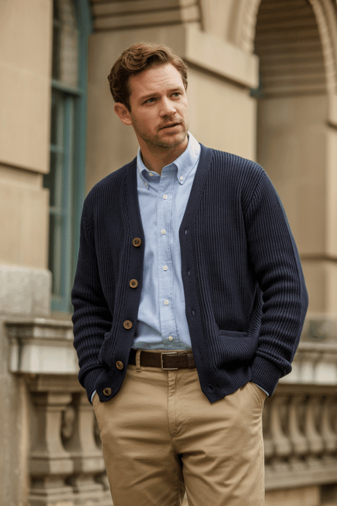 Perfect for a day out — navy cardigan, white Oxford, khaki trousers, and leather loafers.