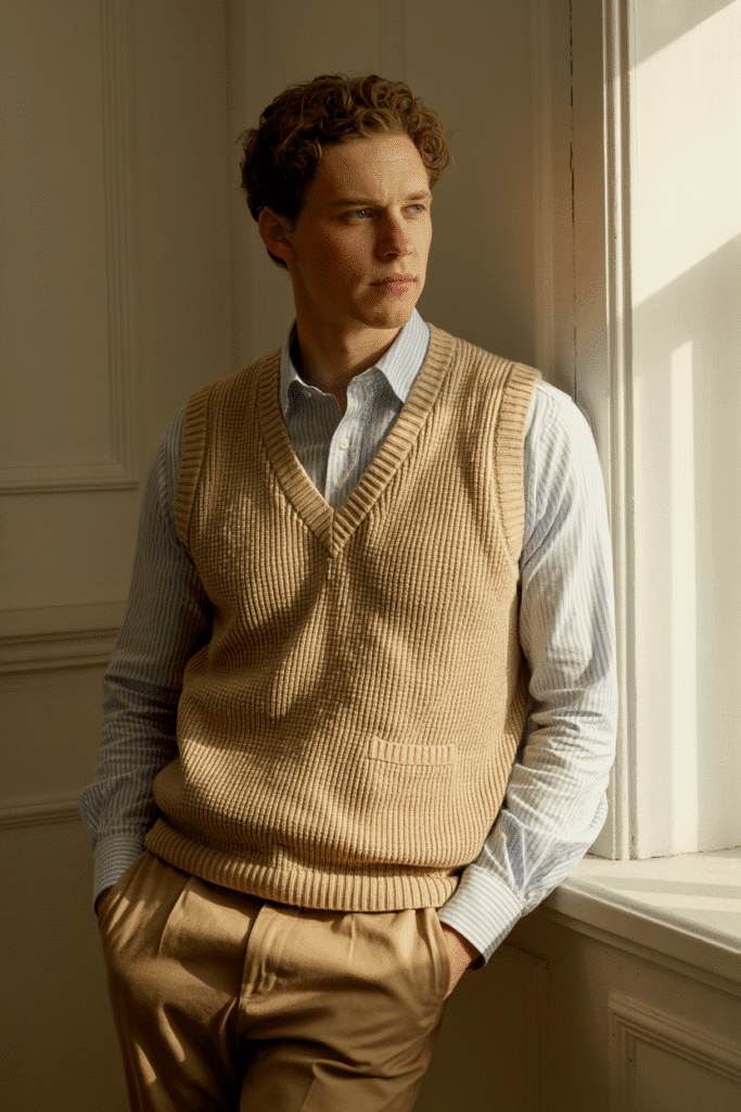 Preppy, polished, and timeless. Opt for a cream cable-knit vest over a sky-blue shirt and neutral chinos.