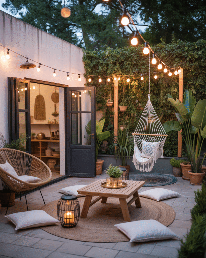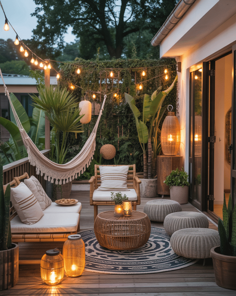 • Lighting: Choose lanterns, woven pendant lamps, or string lights for a soft, warm glow.