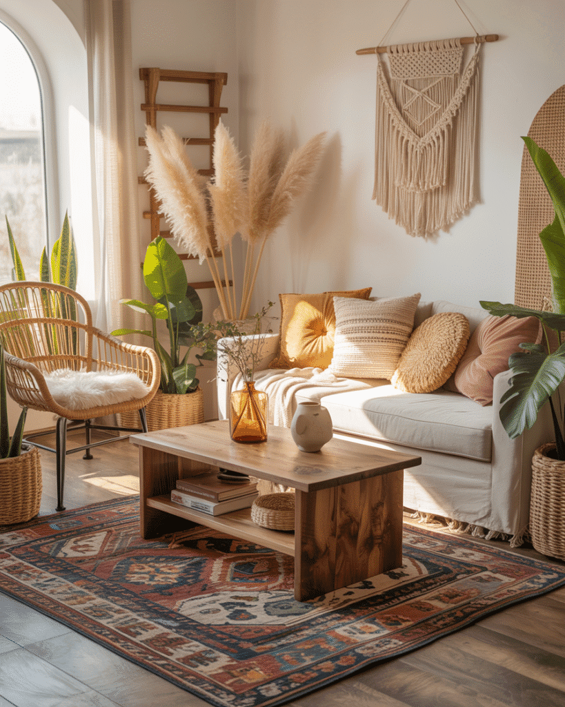 The boho living room is all about comfort and character. Instead of stiff furniture, think soft textures, cozy seating, and layered dΓ©cor.