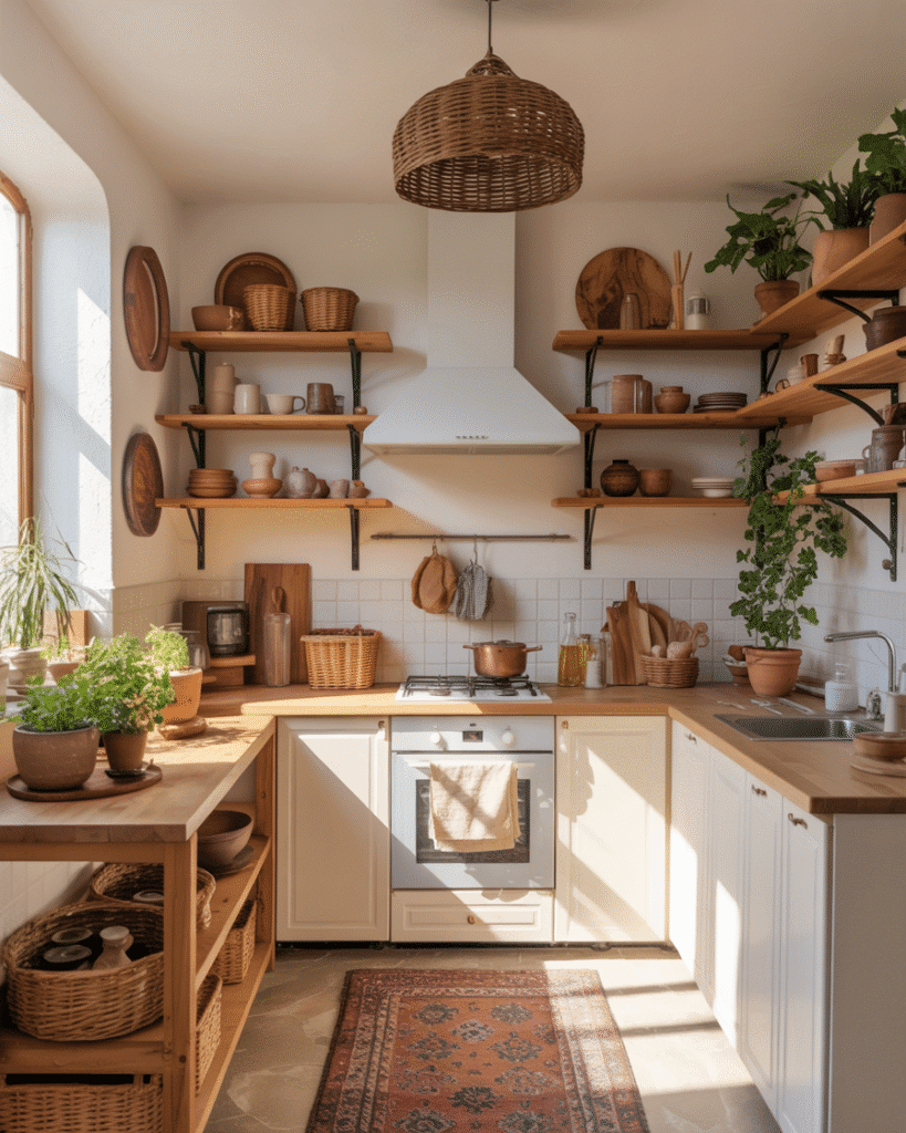 A boho style home also shines in the kitchen and dining areas. Here, the design embraces rustic and handcrafted elements: