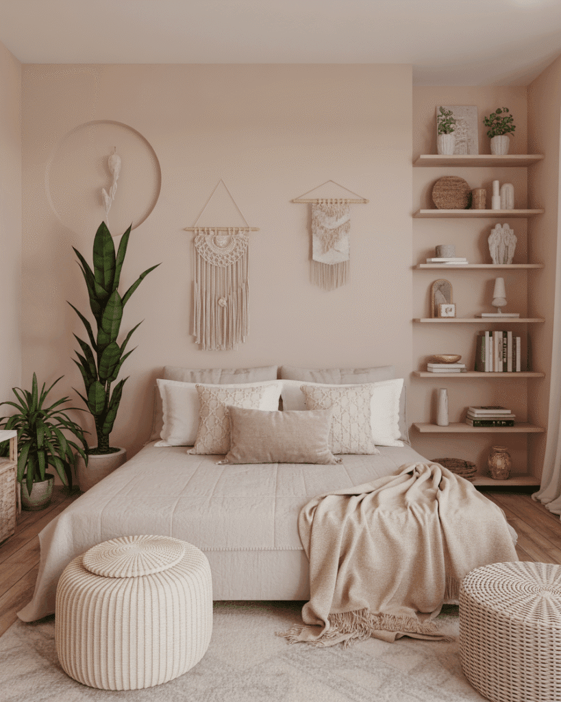 • Bedding: Neutral linens layered with terracotta or mustard throw pillows and chunky blankets.