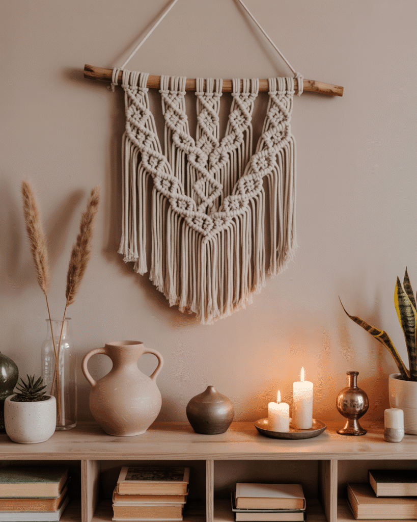 • Walls: Add macramΓ© wall hangings, woven tapestries, or boho art prints.