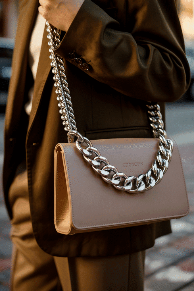 Gold and silver chains are making a big statement in the fall handbag trends 2025. Whether as short handles or crossbody straps, chain details instantly upgrade any bag into a chic statement piece.