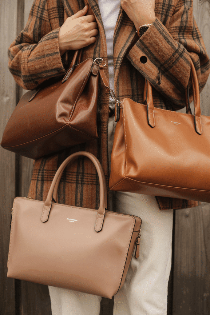 When it comes to colors, fall bags are all about earthy tones – chocolate brown, camel, taupe, and warm beige. These shades are versatile, timeless, and match the cozy autumn aesthetic perfectly.