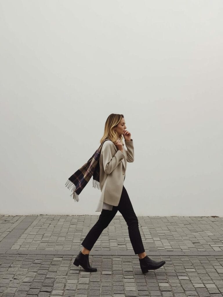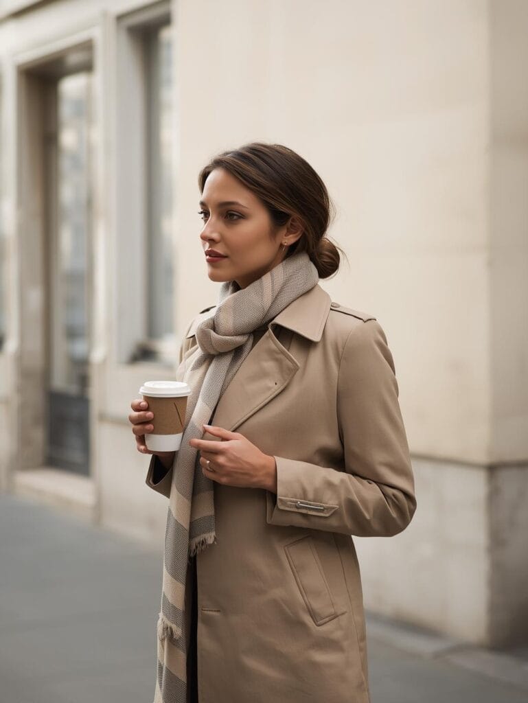 Pair it with a structured coat, a cashmere sweater, or a silk blouse. Choose scarves in neutrals (cream, camel, navy) or classic prints like plaid and houndstooth.
