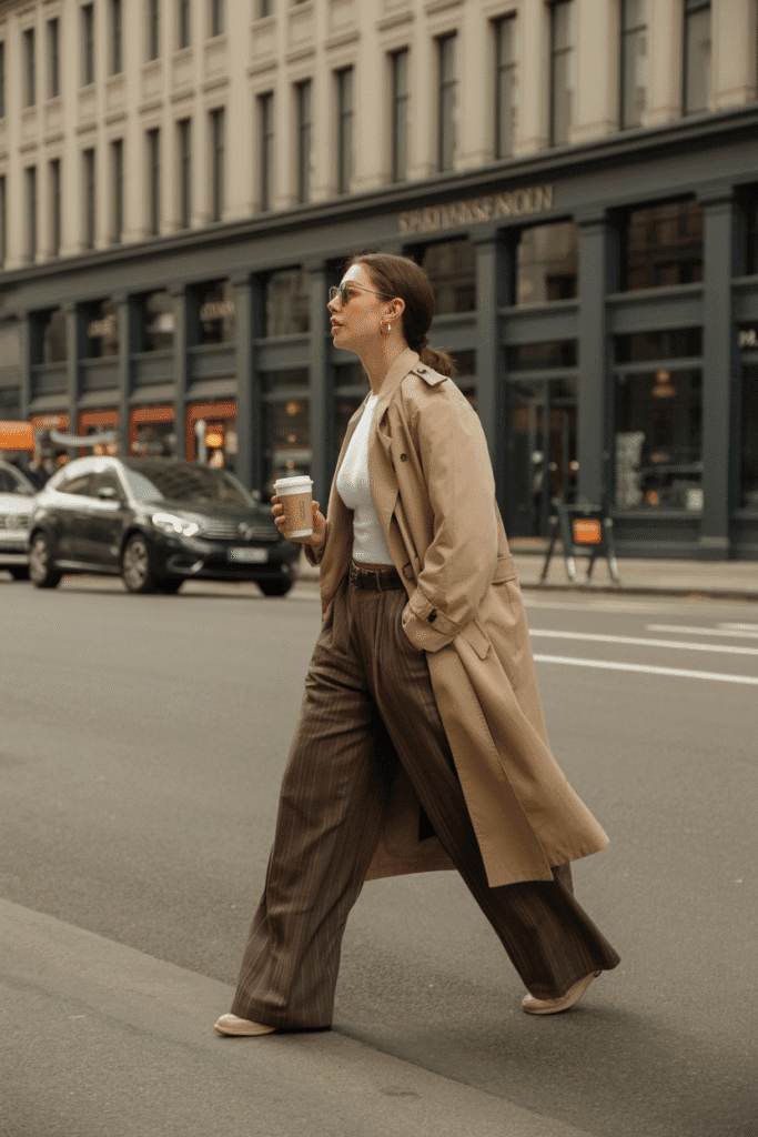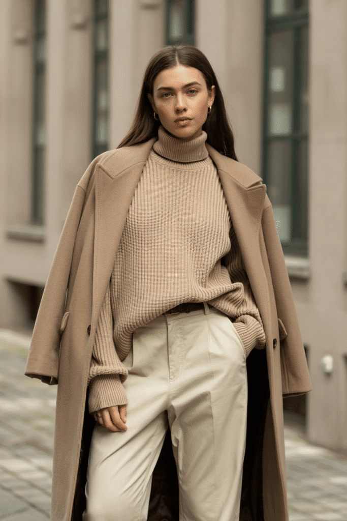 Soft monochrome tones instantly create that “quiet luxury” aesthetic. Add a tan handbag and delicate gold hoops.