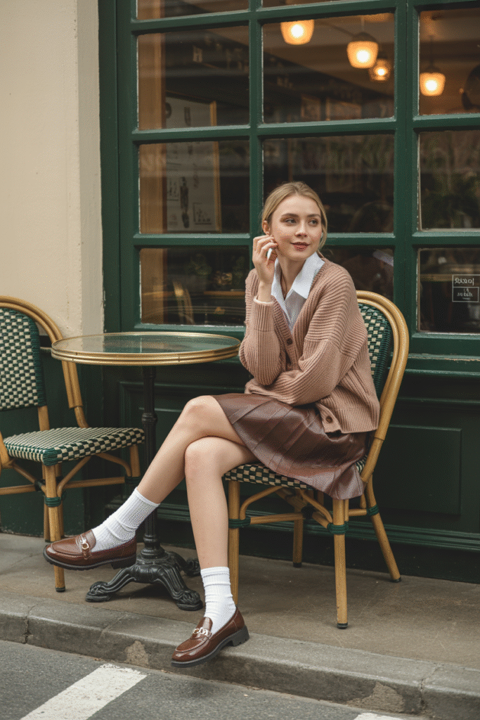 Cable-knit cardigan + collared shirt + midi skirt + loafers.