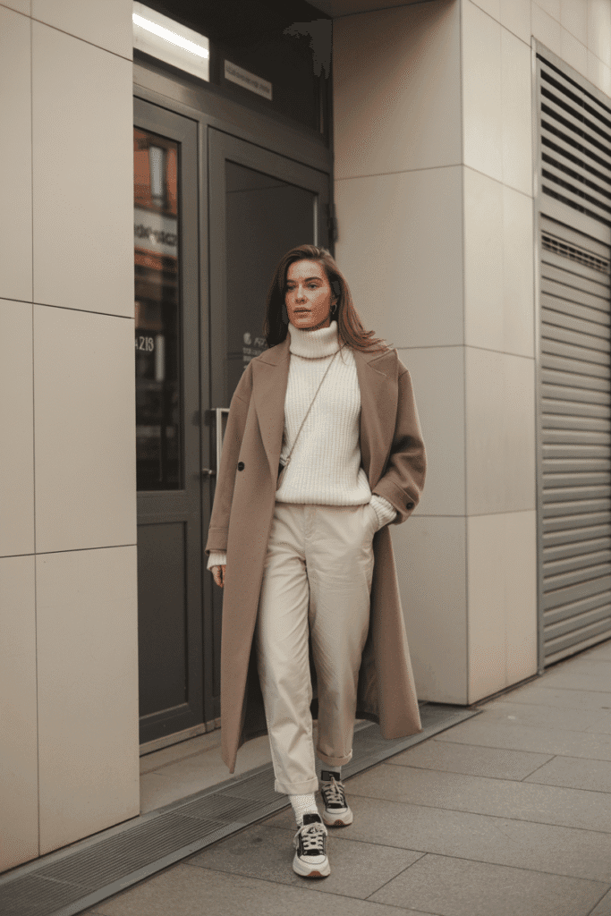 White knit top + beige trousers + camel coat + white sneakers.