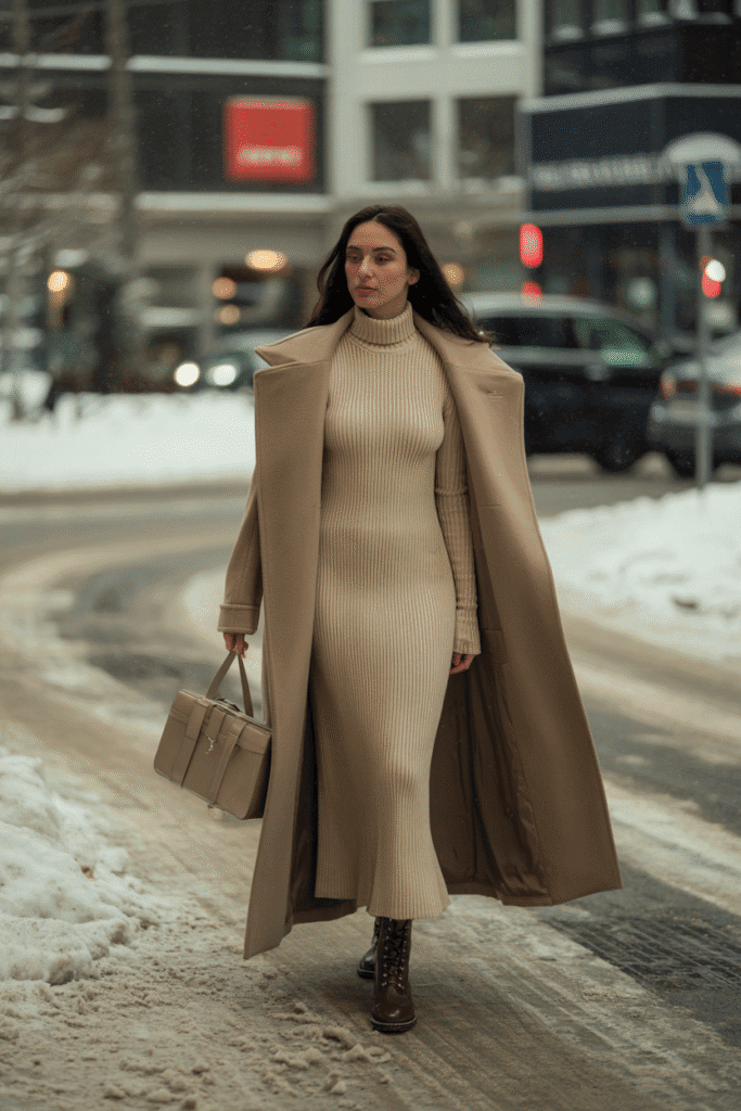 Long beige ribbed dress + wool coat + brown boots + knit scarf.