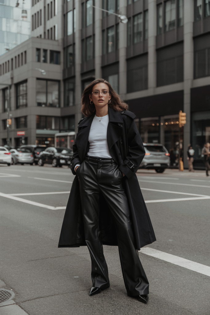Black trench coat + turtleneck + leather trousers + chunky boots.