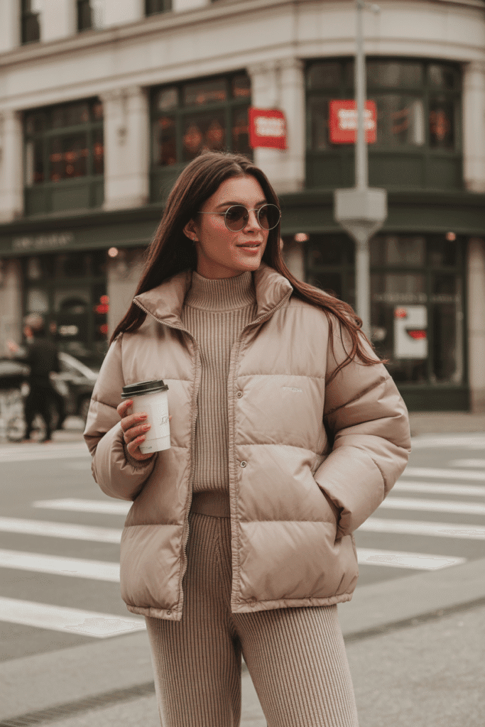 Neutral puffer jacket + ribbed knit set (top + pants) + chunky sneakers.