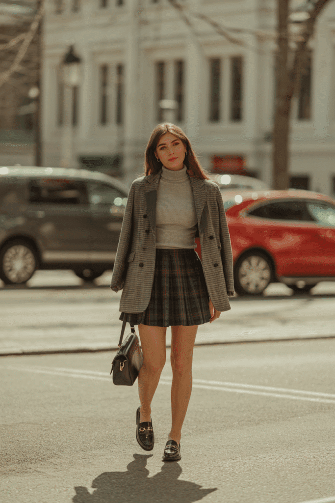 Gray turtleneck + plaid skirt + blazer + tights + loafers.