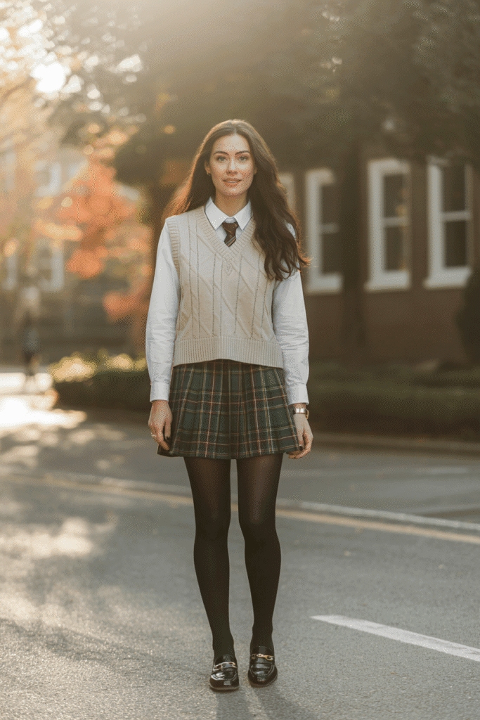 Plaid skirt + navy knit vest + white shirt + loafers + tights.