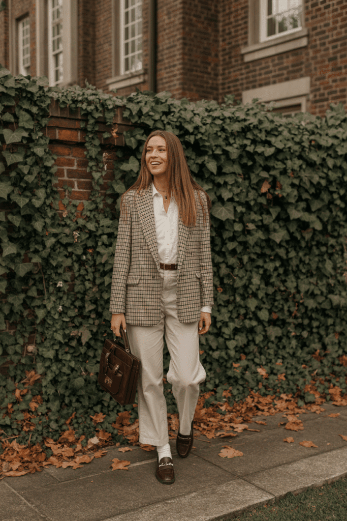 Mix academia with elegance — warm, smart, stylish.