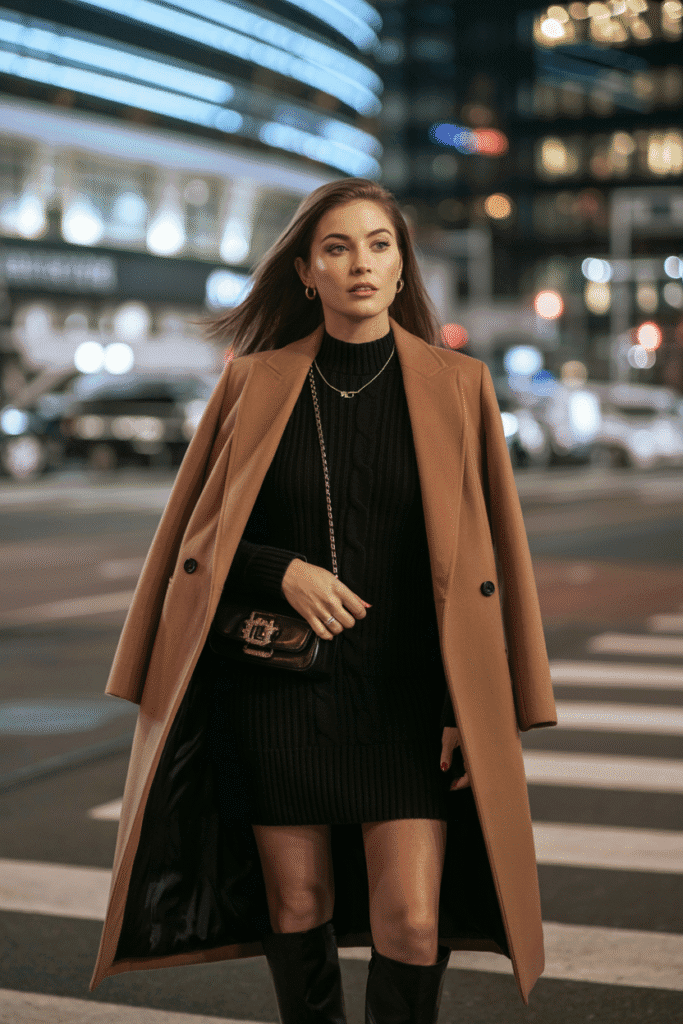 Black midi sweater dress + knee-high suede boots + long camel coat + gold jewelry.