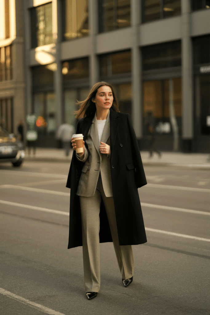 Tailored blazer + slim trousers + wool coat + heeled ankle boots.