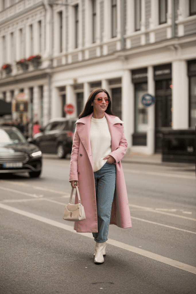 Blush pink coat + white knit sweater + light blue jeans + cream boots.