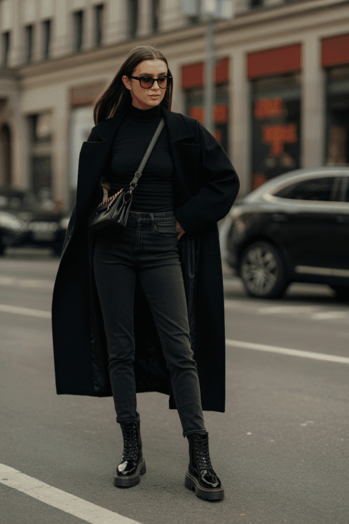 All-black jeans, turtleneck, and oversized coat with combat boots.